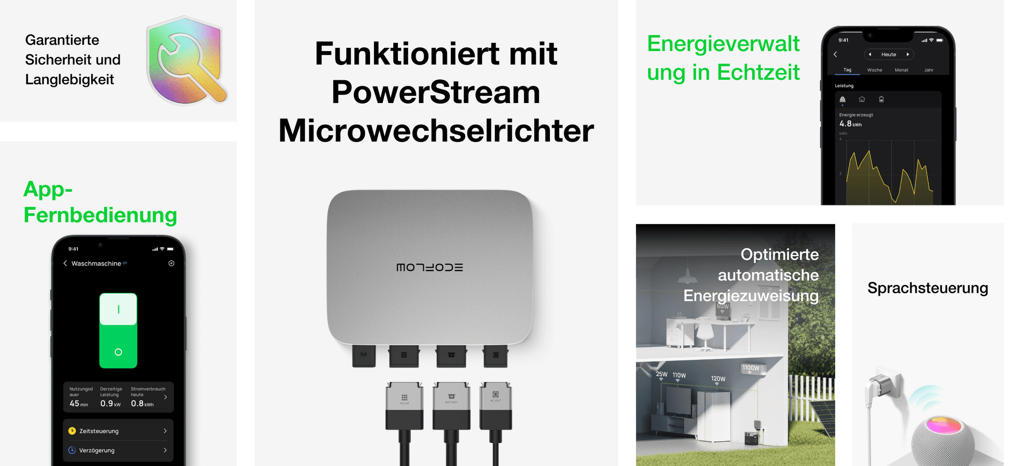 Der EcoFlow Smart Plug ist eine kompakte WLAN-Steckdose, die eine Energieüberwachung und intelligente Steuerung von Geräten ermöglicht. Als Teil des PowerStream Systems arbeitet er mit dem Mikro-Wechselrichter und der EcoFlow-App zusammen, um Echtzeit-Stromverbrauchsstatistiken und eine optimierte automatische Stromzuweisung zu bieten.