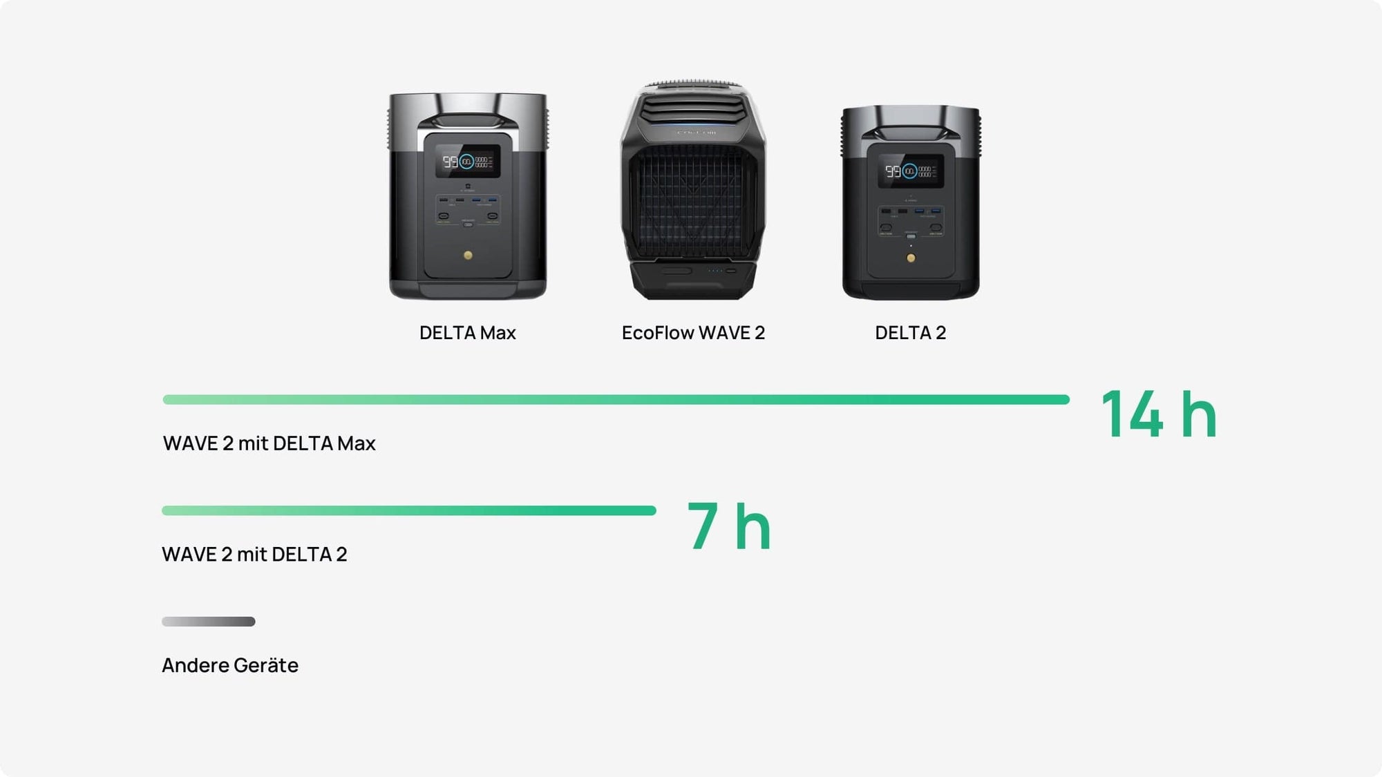 WAVE 2 ist nur der Anfang. Zusammen mit einer EcoFlow DELTA 2/DELTA Max oder deren Zusatzbatterien erhalten Sie eine erstaunliche Laufzeit von 7 bis 14 Stunden im Eco-Modus. Die Nutzung mit diesen Geräten ist 28 % effizienter als mit anderen tragbaren Powerstations. Sie können auch jede andere tragbare Powerstation mit einem 820-W-Eingang zum Laden Ihrer WAVE 2 verwenden.