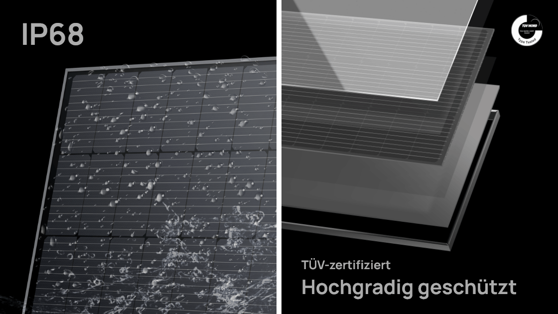 *Die Schutzklasse IP68 für die Wasser- und Staubbeständigkeit wurde unter kontrollierten Laborbedingungen gemäß IEC-Norm 60529 getestet (bis zu 72h in max. 1m Wassertiefe). *Ordnungsgemäß montierte Solarpanele widerstehen einer dynamischen Winddruckbelastung von 2.400 Pa (210 km/h Windgeschwindigkeit) und einer statischen Schneelast von 5.400 Pa (51 kg/0,1 qm Schnee).