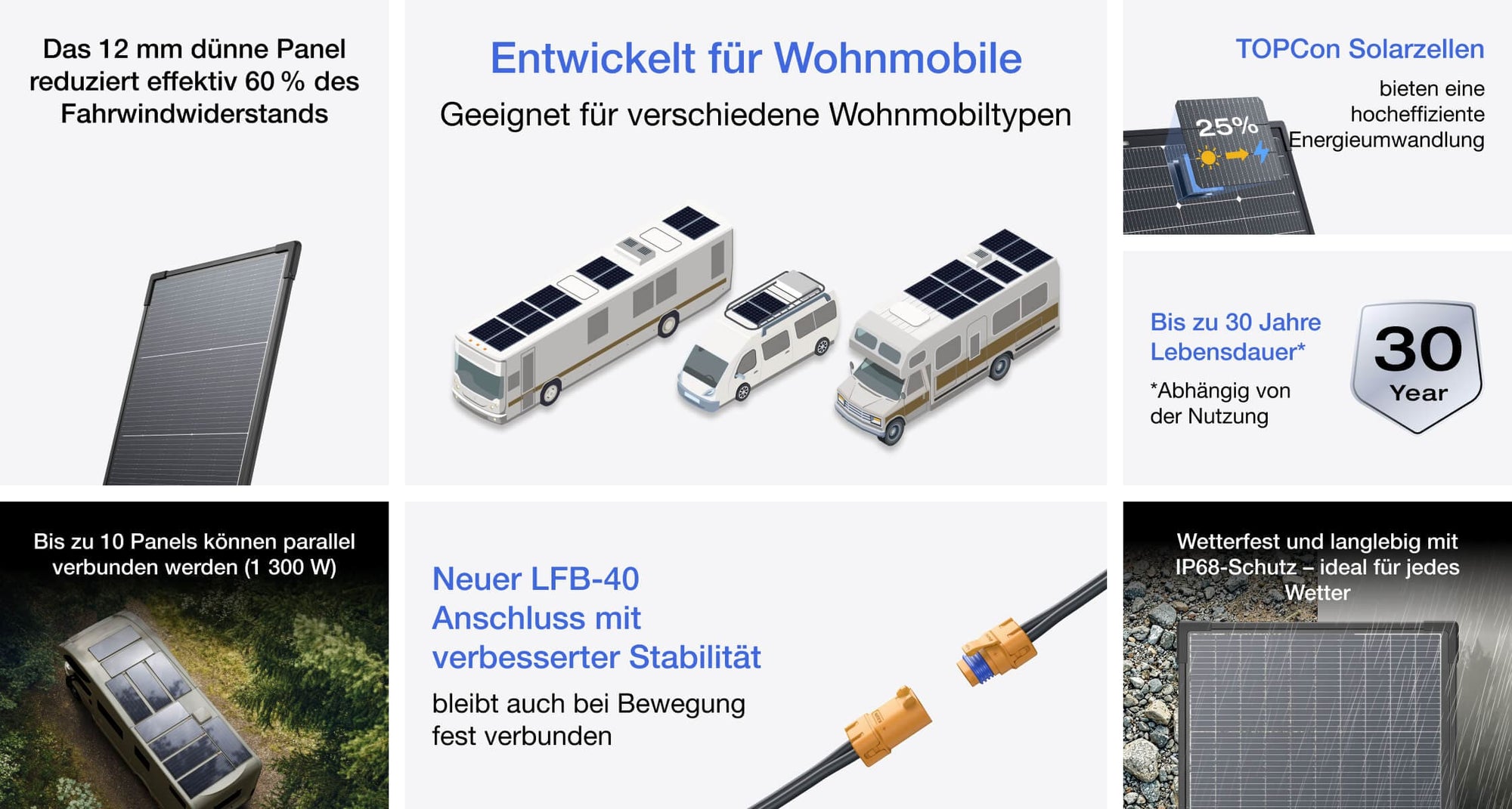 Mit einer Lebensdauer von 30 Jahren ist dieses langlebige, wartungsarme Solarpanel ideal für Wohnmobile.