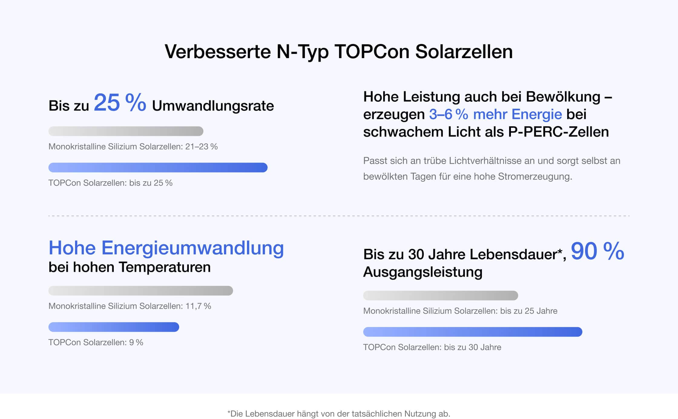 Mit N-Typ TOPCon Technologie wird eine Umwandlungsrate von bis zu 25 % erreicht.