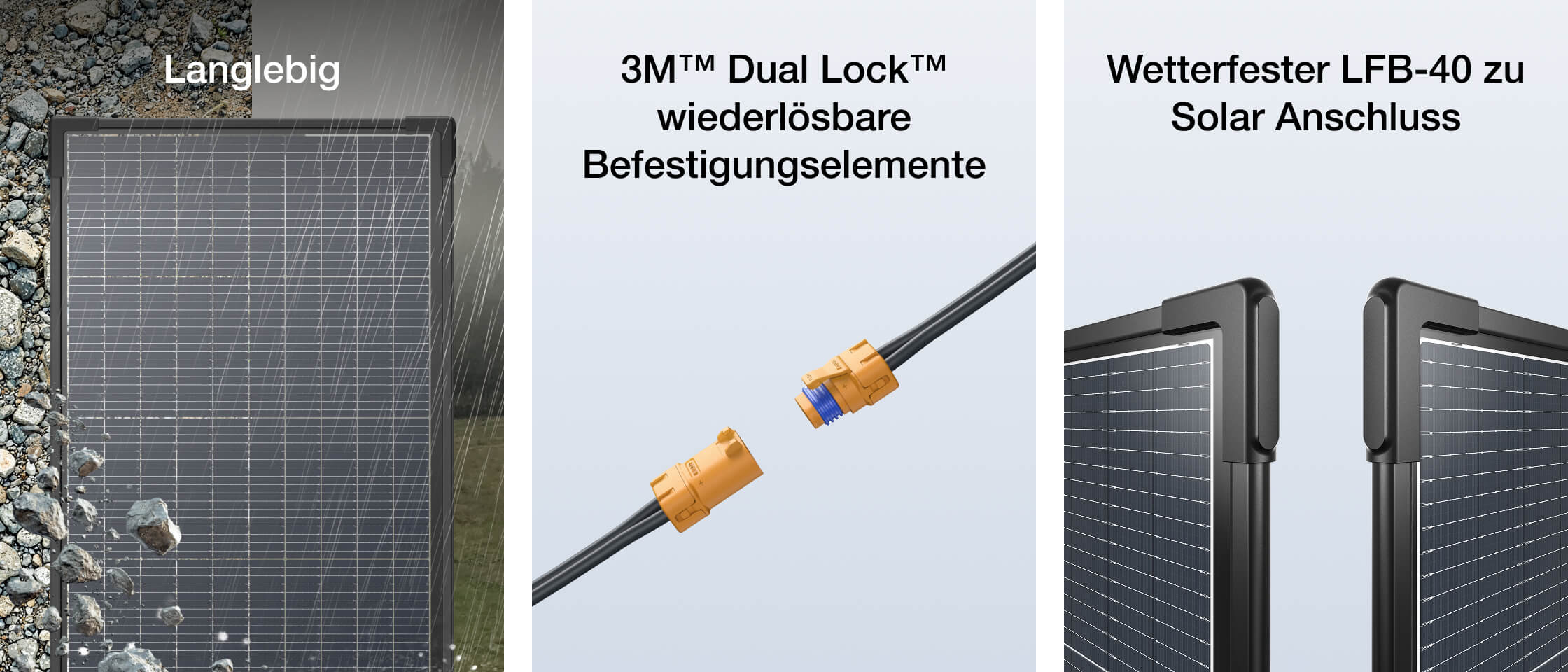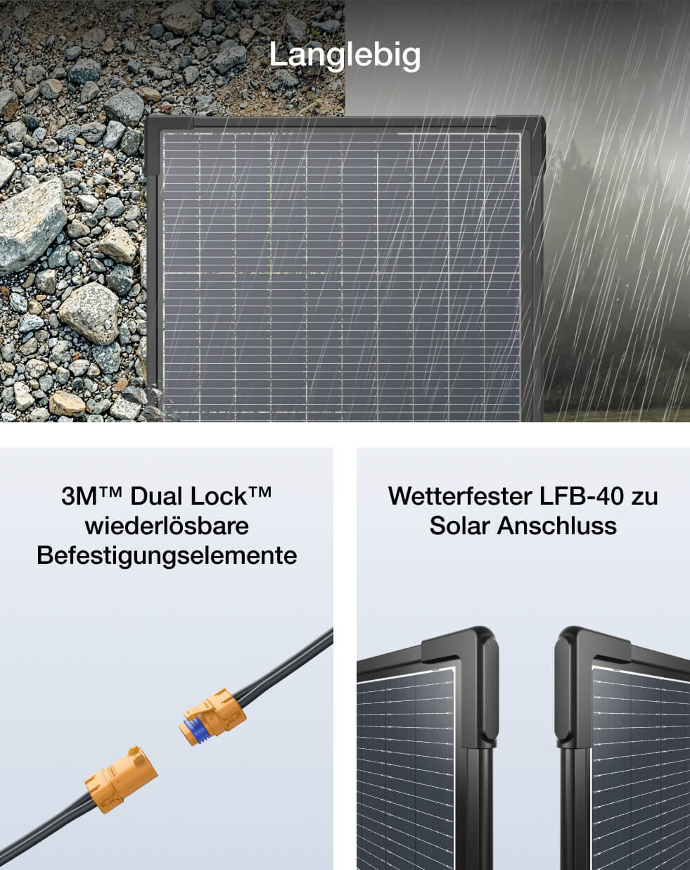 Ausgelegt für den dauerhaften Einsatz: TOPCon Solarzellen mit nur 2 mm dünnem gehärtetem Glas maximieren die Lichtdurchlässigkeit und bieten gleichzeitig zuverlässigen Schutz vor Schmutz, Stürmen oder Hagel. Verstärkte Ecken des RVMax verhindern Stoßschäden und verdeckte Risse, wie sie bei herkömmlichen Solarpanels häufig auftreten. Mit Schutzklasse IP68 und dem wetterfesten LFB-40 Anschluss liefert dieses Panel auch bei Regen, Staub und schwierigen Wetterverhältnissen verlässlich Energie.