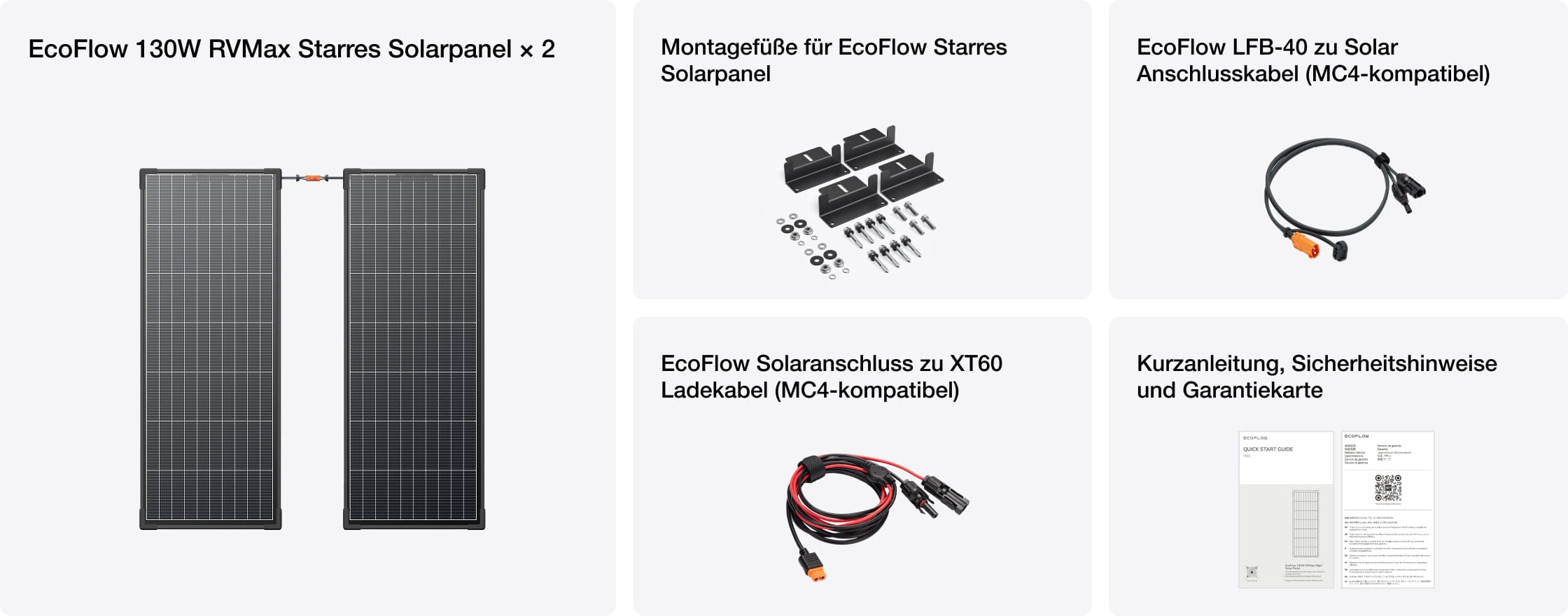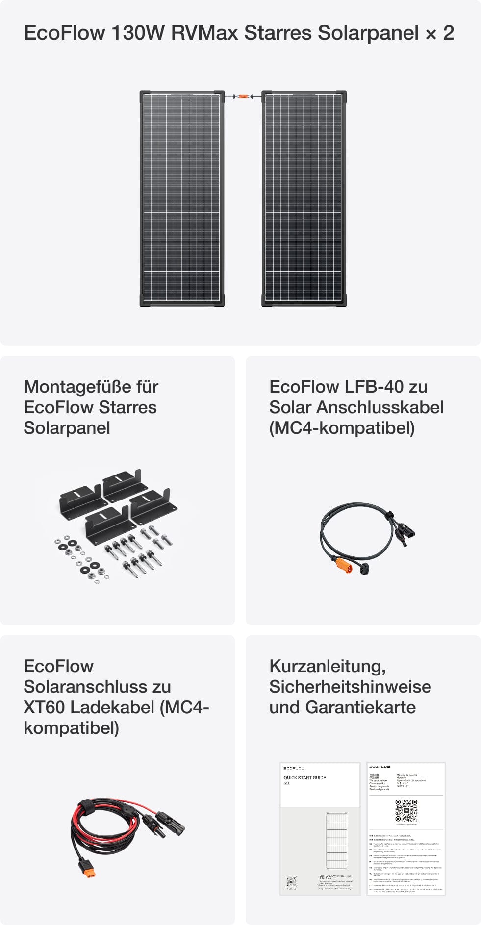 Das EcoFlow 130W RVMax Starre Solarpanel verfügt über ein innovatives modulares Design mit bis zu 130 W Leistung, 50 V Spannung und 3 A Stromausgang. Es lassen sich bis zu 10 Panels sicher verbinden – ideal für verschiedene Powerstationen.