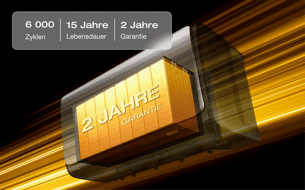 Ausgestattet mit fortschrittlichen LFP‑Batteriezellen liefert STREAM bis zu 6 000 Ladezyklen bei 70 % Kapazität und hält damit bis zu 3× länger als herkömmliche Batterien. Das bedeutet bis zu 15 Jahre zuverlässige Nutzung, abgesichert durch 2 Jahre Garantie.