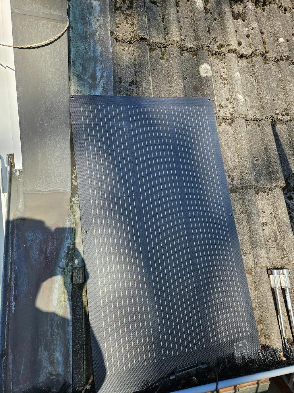 Dank der vorgestanzten Ösen kann das flexible Solarpanel an Haken aufgehängt oder mit Klebstoff sicher an einer Oberfläche fixiert werden.
