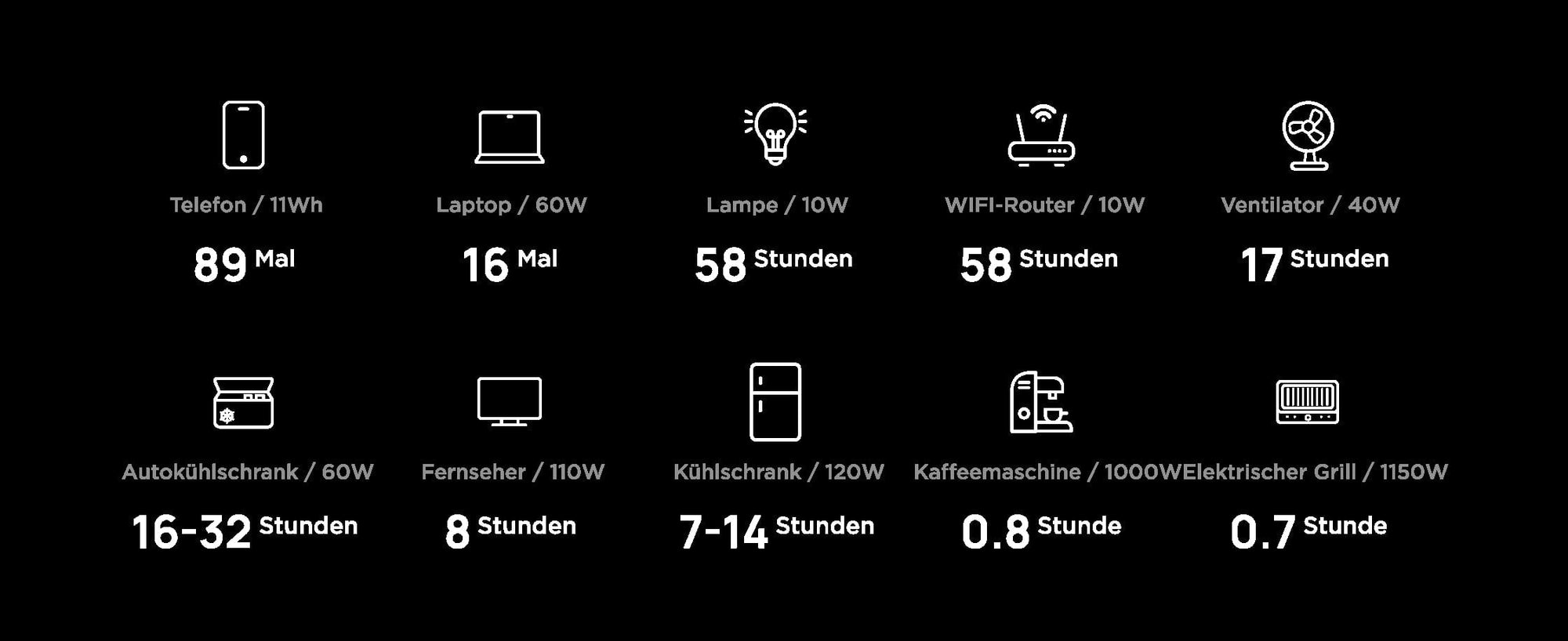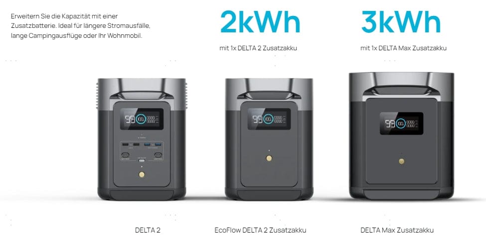 Mit einer Basiskapazität von 1 kWh haben Sie immer genug Strom, wenn es darauf ankommt. Benötigen Sie mehr? Verdoppeln Sie Ihre Kapazität mit dem DELTA 2-Zusatzakku auf 2.048 Wh, oder nutzen Sie den DELTA Max-Zusatzakku, um 3.040 Wh zu erreichen. Ideal als Notstromversorgung für Haushaltsgeräte.