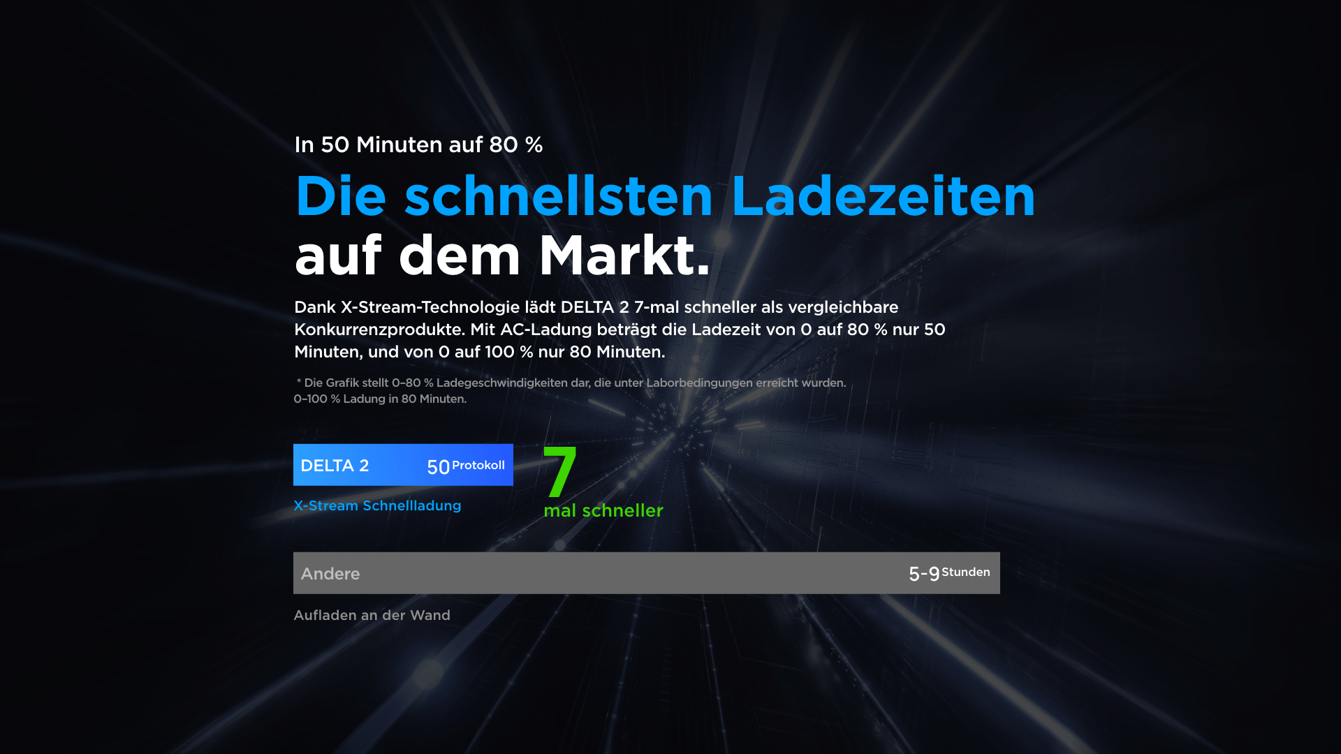 In Kombination mit 1x 400 W oder 2x 200 W Solarpanelen ist das Gerät innerhalb von 3–6 Stunden aufgeladen. Der intelligente MPPT-Algorithmus (Maximum Power Point Tracking) der DELTA 2 misst automatisch Stromspannung und Stromstärke in Echtzeit, um den maximalen Leistungspunkt zu nutzen und so mit einem Wirkungsgrad von > 98 % zu laden. Eine höhere Ladeeffizienz als bei Konkurrenzprodukten.