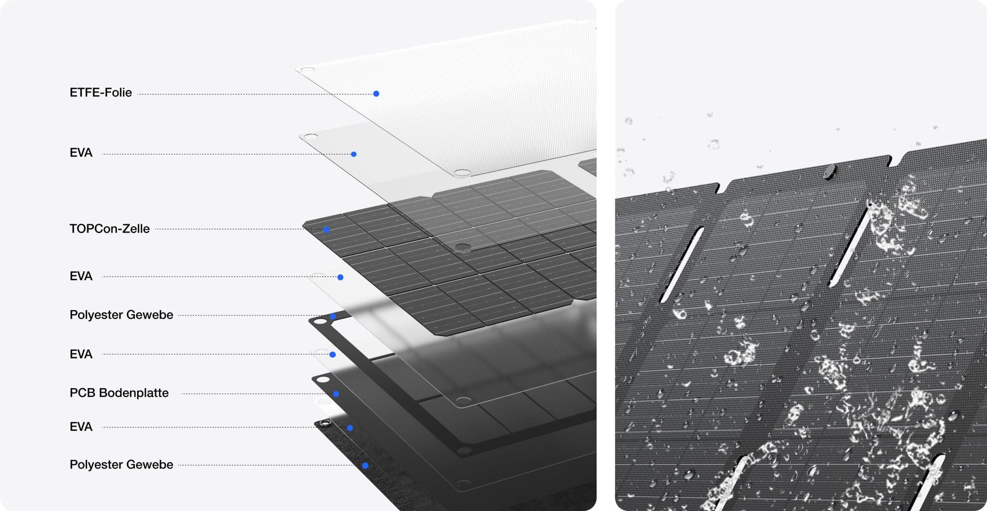 Dank der robusten PCB-Glasfaser und der langlebigen ETFE-Beschichtung sind unsere Panele so konzipiert, dass sie anspruchsvollen Wetterbedingungen standhalten. Ob bei plötzlichen Stößen, im Wind oder im Kontakt mit salzhaltiger Gischt und Wassertropfen - sie bleiben unversehrt und robust und sind Ihr zuverlässiger Begleiter im Freien*.