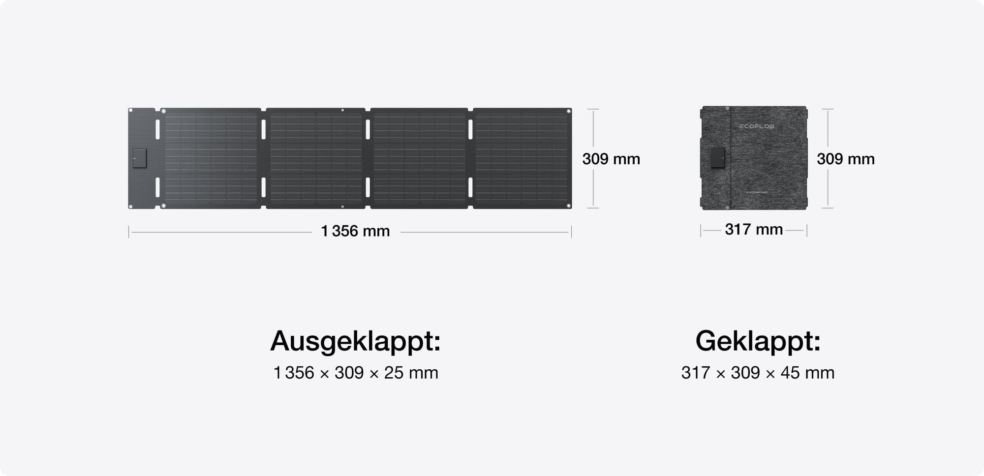 Durch die faltbare Vier-Panel-Konstruktion ist das tragbare Solarpanel im zusammengeklappten Zustand deutlich kleiner und lässt sich problemlos in Rucksäcken und Kofferräumen verstauen.