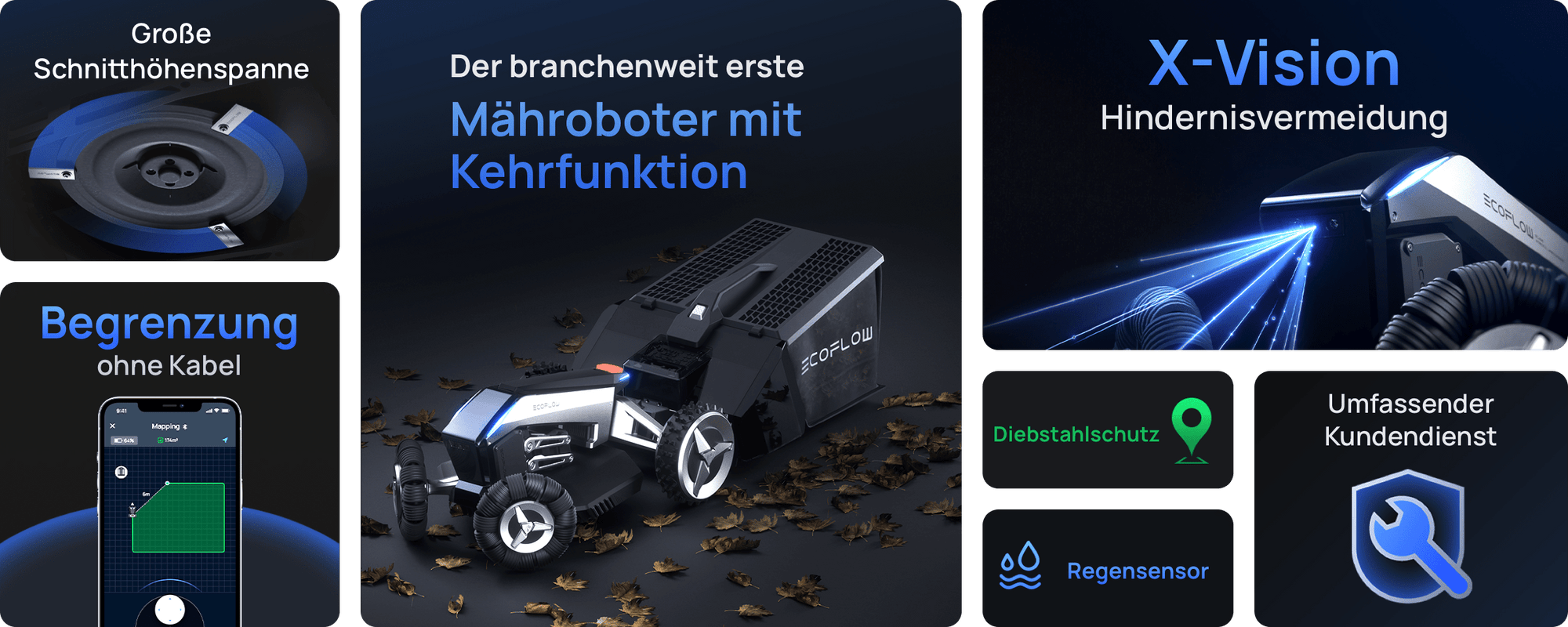 BLADE nutzt X-Vision, EcoFlows neueste Spitzentechnologie. Durch die Kombination von visuellen Sensoren und LiDAR erkennt und umfährt BLADE große und kleine Hindernisse – von Ihren Gartenmöbeln bis zu den preisgekrönten Begonien Ihrer Nachbarn.