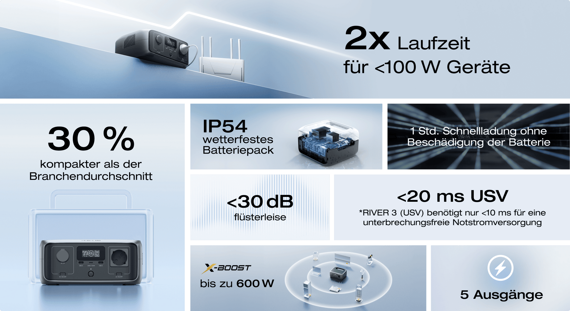 Die RIVER 3 Serie revolutioniert die Energieeffizienz und ermöglicht eine bis zu doppelte Laufzeit für Geräte mit geringer Leistung – sowohl zu Hause als auch unterwegs. Die Daten wurden unter kontrollierten Laborbedingungen getestet, die tatsächliche Nutzererfahrung kann variieren.
