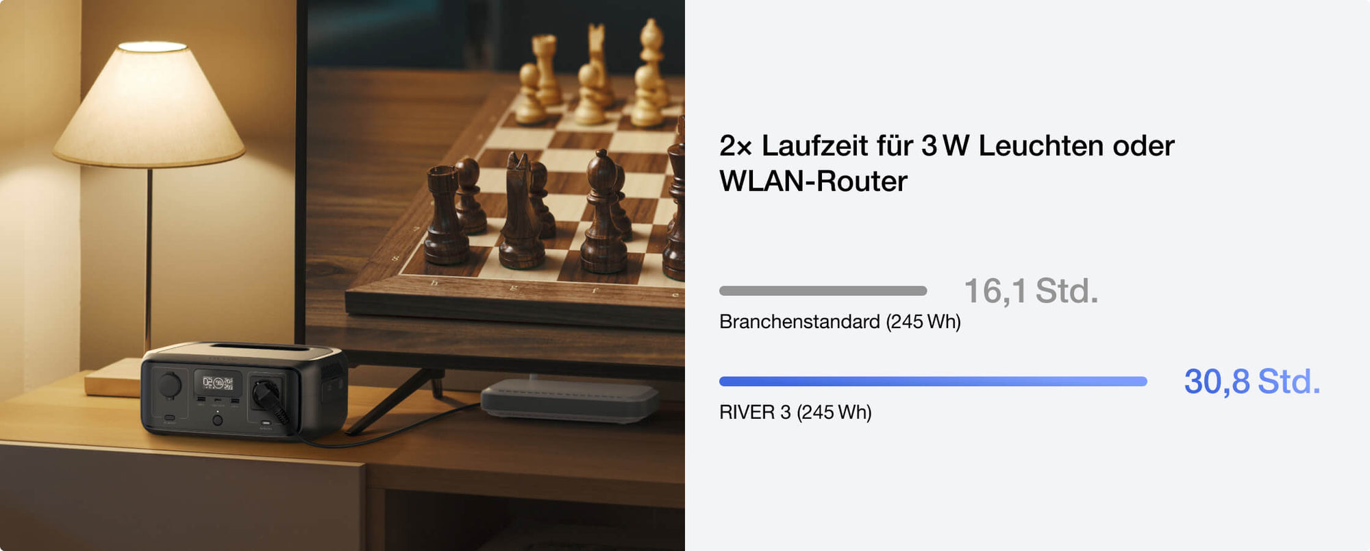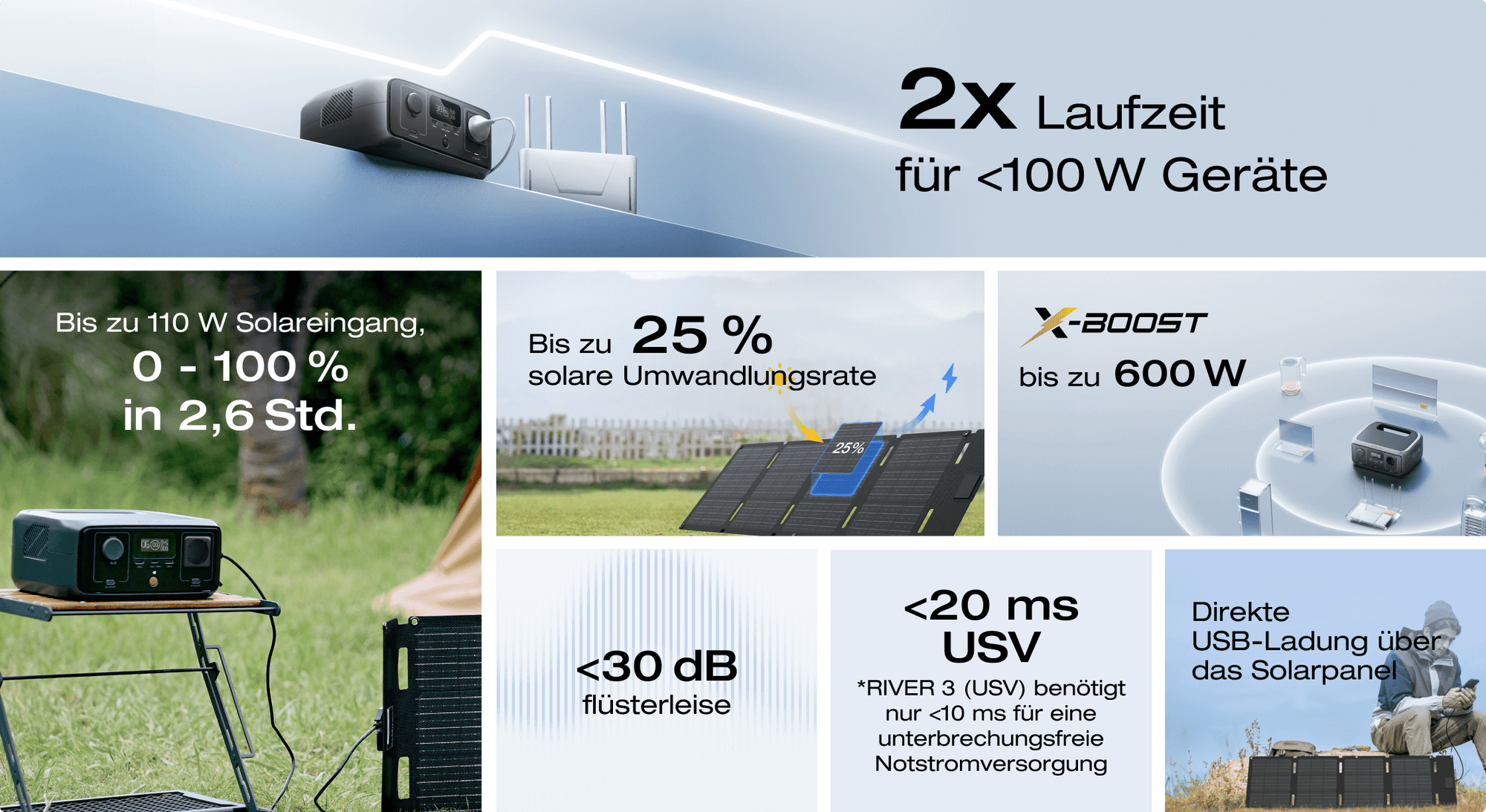 RIVER 3 revolutioniert die Energieeffizienz, verdoppelt die Laufzeit für Verbraucher unter 100 W und verlängert so die Nutzungsdauer zu Hause und unterwegs.¹