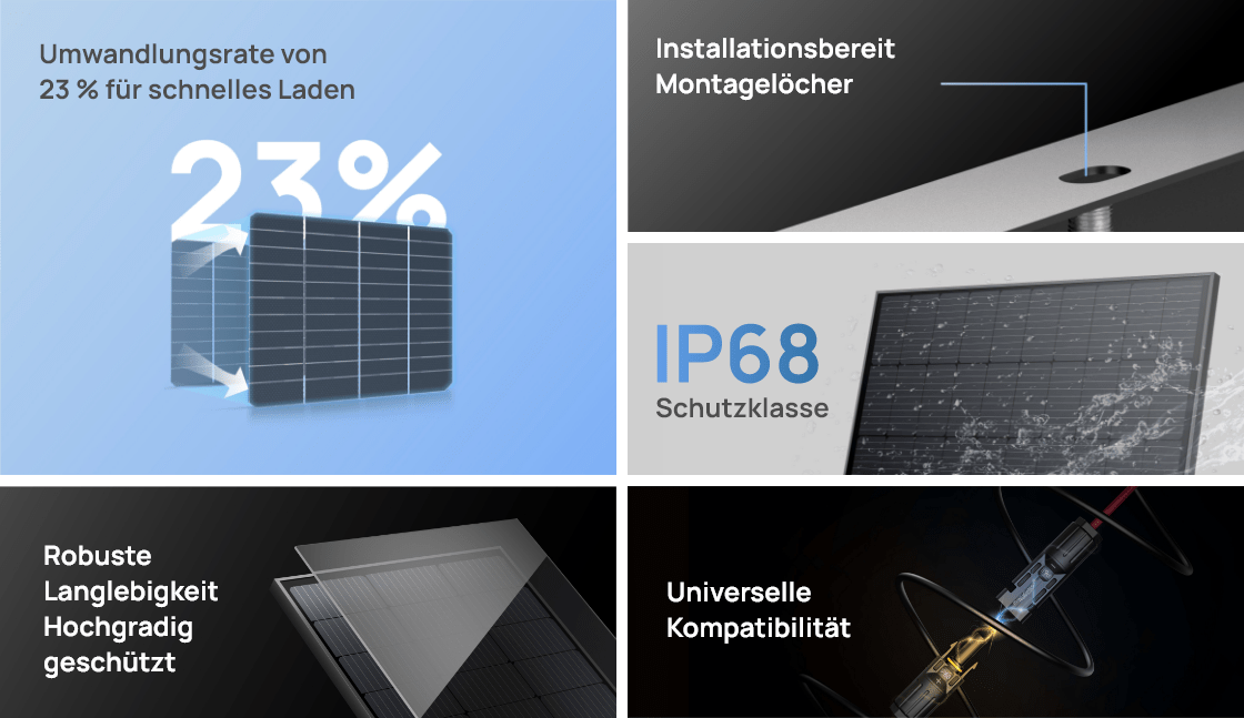 Mit der überragenden Umwandlungsrate unserer 100W starren Solarpanele von 23 % können Sie noch schneller laden. Wenn Sie es mit Ihrem Power Kits oder Ihrer EcoFlow tragbaren Powerstation zusammen benutzen, optimiert der integrierte MPPT-Algorithmus Ihre Solarenergieeinspeisung.