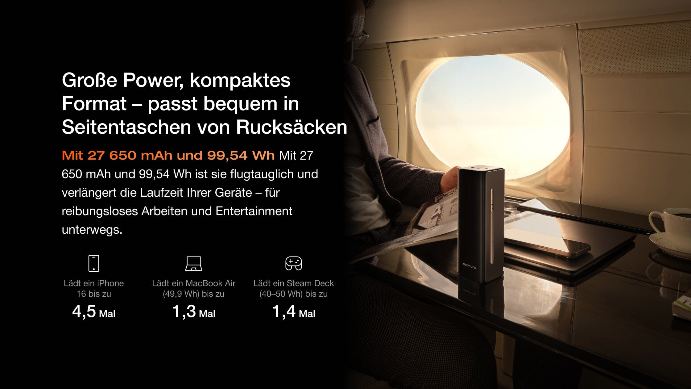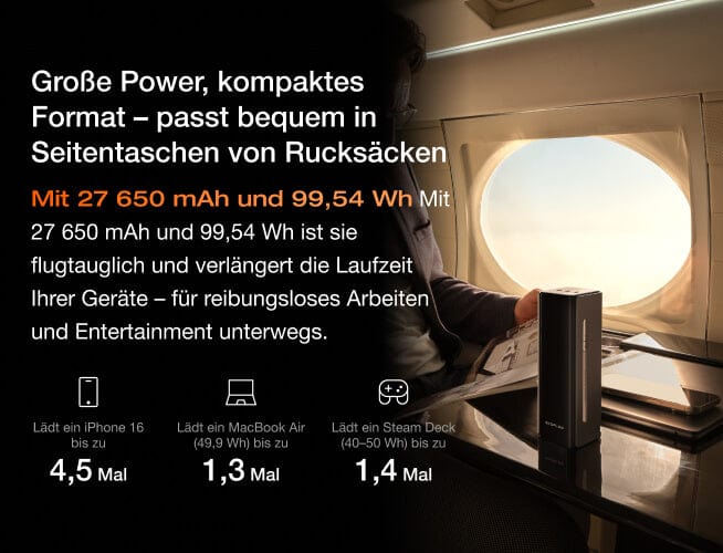 Ja, gemäß den Vorschriften der Internationalen Zivilluftfahrtorganisation (ICAO) und der meisten Fluggesellschaften ist das Mitführen einer Powerbank mit einer Kapazität von unter 100 Wh erlaubt. Die RAPID Pro mit einer Kapazität von 27 650 mAh (99,54 Wh) erfüllt diese Anforderung und kann ohne Bedenken an Bord mitgenommen werden.