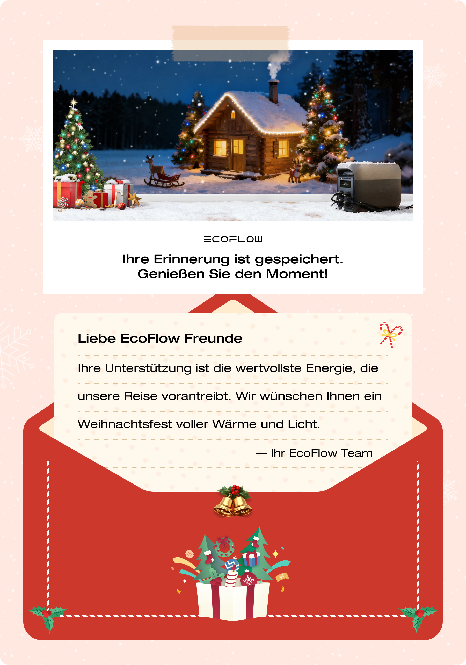 Geschenke & Gutscheine: 1. Vom 5. bis 11. Dezember: Es wird ein zeitlich begrenzter, websiteweiter Rabattcoupon in Höhe von 8 % gewährt (ausgenommen die DELTA 3 Max Serie sowie mehrere STREAM Serie-Bundles, darunter: ULTRA + 4*450 W Solarpanel, ULTRA + AC Pro + 4*450 W Solarpanel, ULTRA + 2 × AC Pro + 4*450 W Solarpanel, ULTRA + Pro + 6*450 W Solarpanel, ULTRA + 2 × Pro + 6*450 W Solarpanel); gültig nur vom 5. Dezember bis 11. Dezember. 2. Vom 12. Dezember bis zum 2. Januar: Es kann zwischen einem 50 € Coupon für die DELTA 3 Max Serie oder einem zeitlich begrenzten Rabattcoupon von 8 % gewählt werden. Der 8 % Coupon ist nur im Zeitraum vom 12. Dezember bis 1. Januar gültig (ausgenommen die DELTA 3 Max Serie sowie mehrere STREAM Serie-Bundles, darunter: ULTRA + 4*450 W Solarpanel, ULTRA + AC Pro + 4*450 W Solarpanel, ULTRA + 2 × AC Pro + 4*450 W Solarpanel, ULTRA + Pro + 6*450 W Solarpanel, ULTRA + 2 × Pro + 6*450 W Solarpanel).