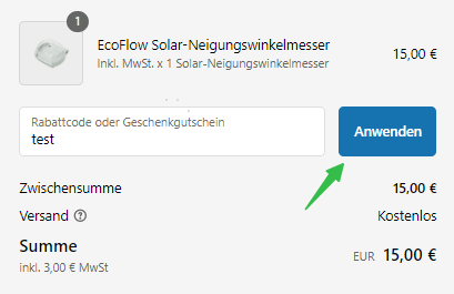 Sie können an der Kasse einen Rabattcode und eine Geschenkkarte auf Ihre Bestellung anwenden. Nachdem Sie Ihren Rabattcode oder Ihre Geschenkkarte eingegeben haben, klicken Sie auf „Anwenden“ und der Rabatt wird automatisch von Ihrem Bestellwert abgezogen. Bitte beachten Sie: Wenn Sie nicht auf „Anwenden“ klicken, bevor Sie zur Kasse gehen, wird der Gutschein- und Geschenkkartenrabatt nicht auf den Gesamtbetrag Ihrer Bestellung angerechnet.