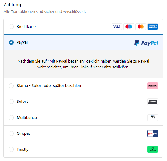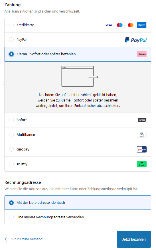 Klarna bietet je nach Land und Transaktionsbetrag verschiedene Zahlungsoptionen an. Zu den angebotenen Optionen gehören: