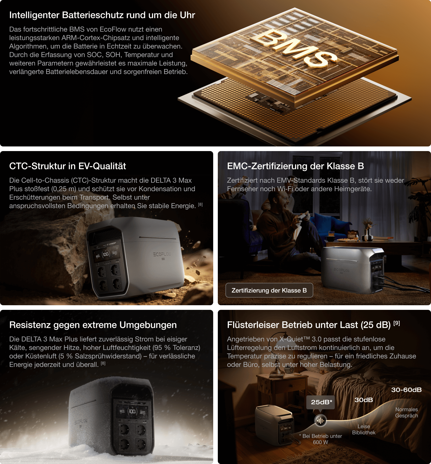 DELTA 3 Max Plus ist auf extreme Haltbarkeit, Umweltsicherheit und flüsterleisen Betrieb ausgelegt — liefert über 10 Jahre verlässliche Energie [2].