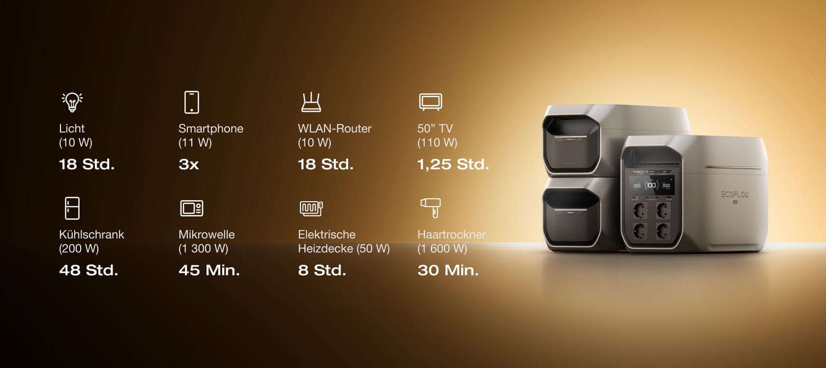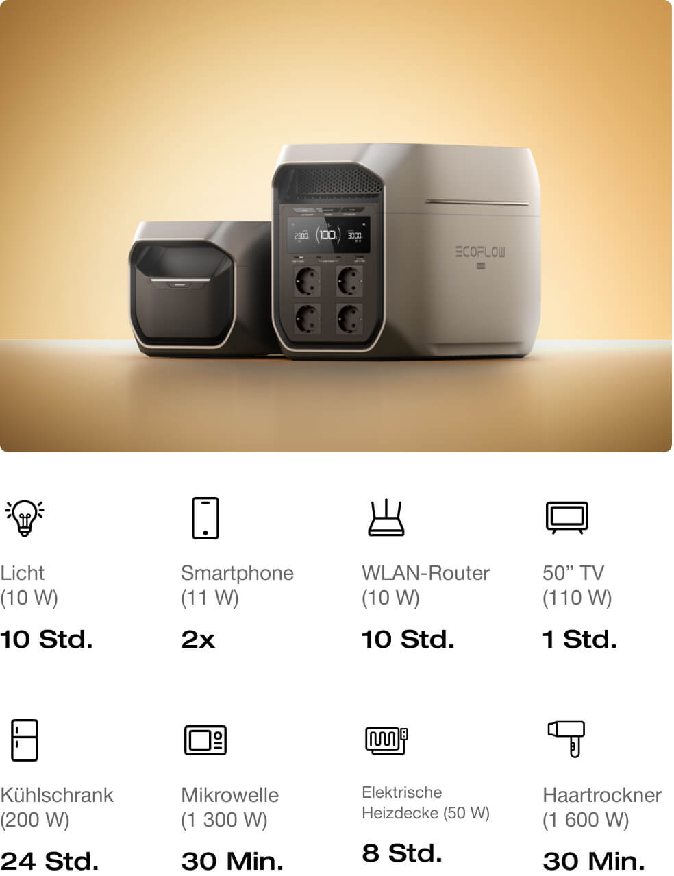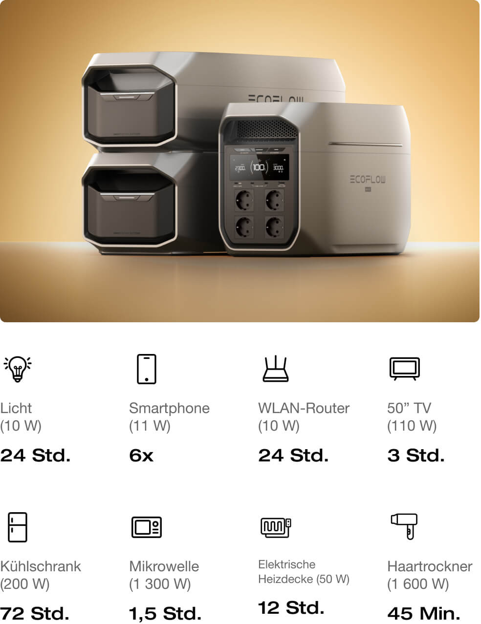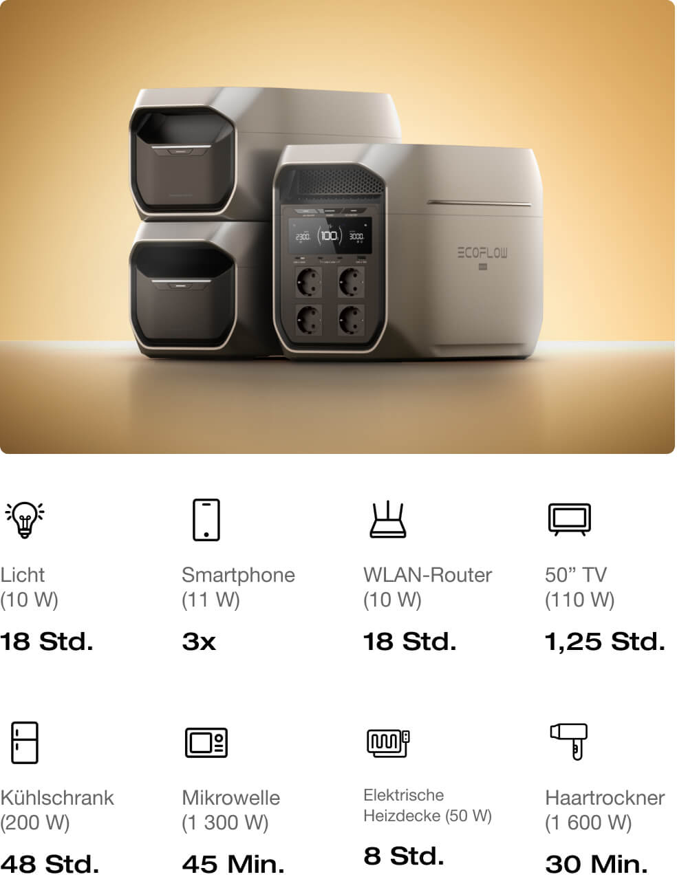 17. Erfordert den Anschluss von 1 × DELTA 3 Max Plus + 2 × DELTA Pro 3 Intelligente Zusatzbatterien mit dem EcoFlow Intelligente Zusatzbatterie Erweiterungsadapter. Der EcoFlow Zusatzbatterie Erweiterungsadapter wird in Kürze veröffentlicht.