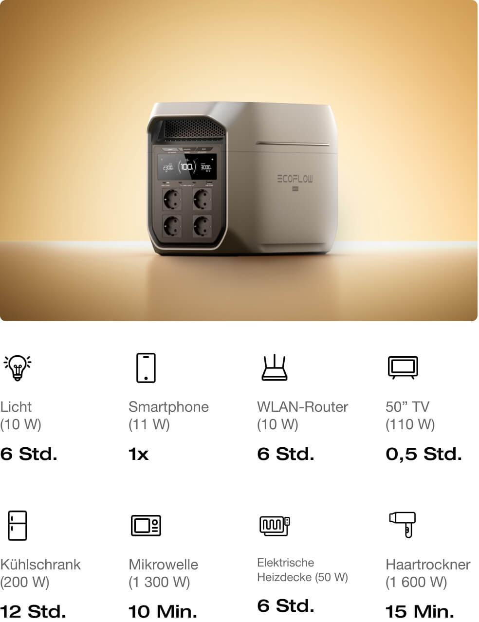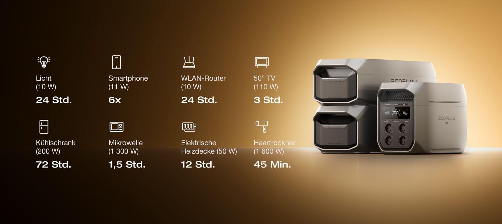 DELTA 3 Max Plus liefert 3 000 W Ausgang — genug, um Mikrowelle, Wasserkocher, Kühlschrank und Mixer gleichzeitig zu betreiben. Alles läuft auf Hochtouren. Keine Unterbrechungen, kein Ausstecken — einfach nahtlose Energie [4].