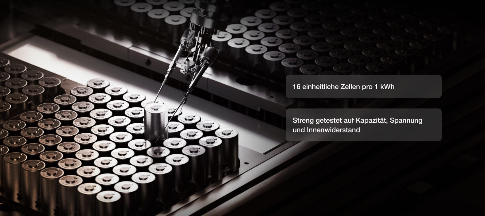 27 % weniger Zellen pro kWh [7], 16-Zellen-Design läuft kühler, langlebiger und stabiler. Jede Zelle wird auf Kapazität, Spannung und Innenwiderstand geprüft – für ein gleichmäßiges Batteriepack, das Überladung, Ungleichgewicht und vorzeitigen Verschleiß verhindert.