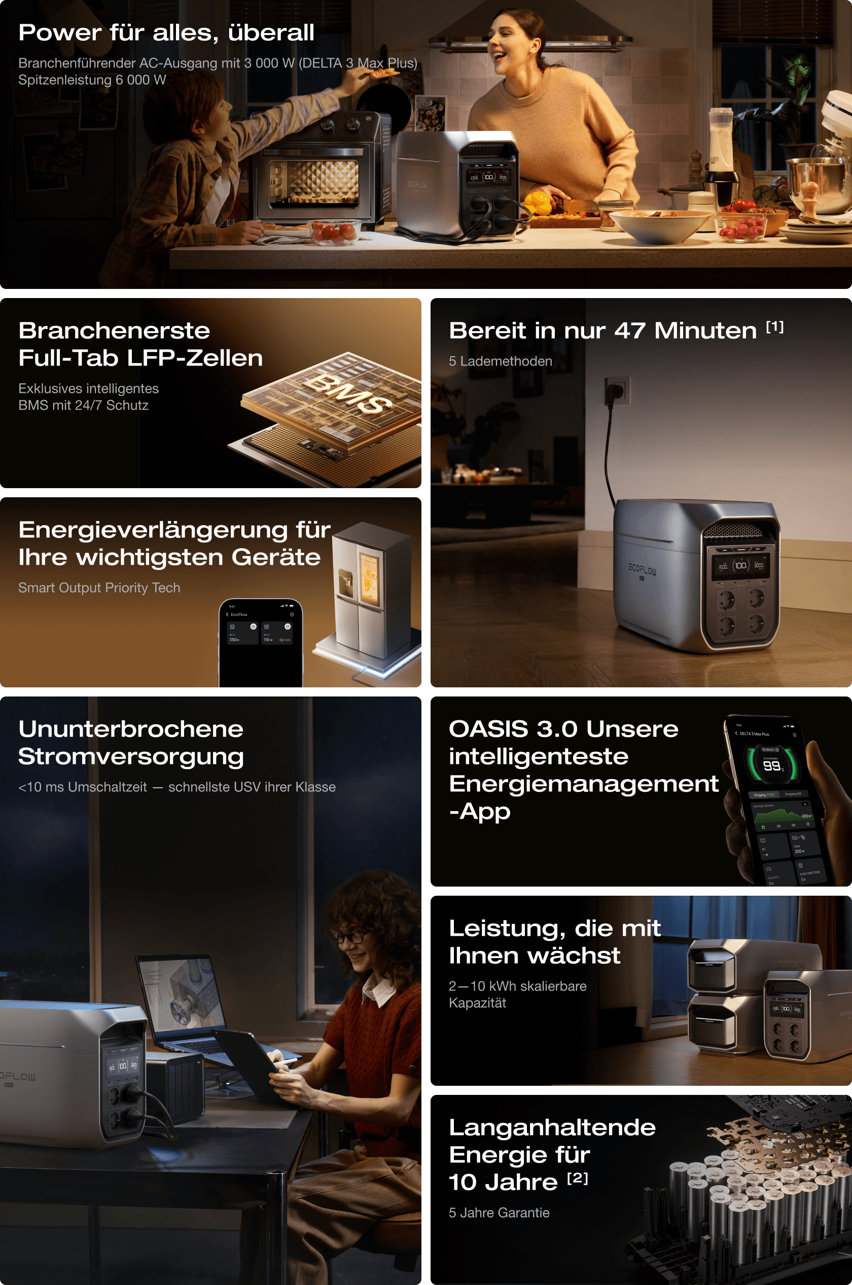 * Erfordert den Anschluss von 1 × DELTA 3 Max Plus + 2 × DELTA 3 Max Plus Intelligente Zusatzbatterie mit dem EcoFlow Intelligente Zusatzbatterie Erweiterungsadapter. Der EcoFlow Zusatzbatterie Erweiterungsadapter ist bald erhältlich.