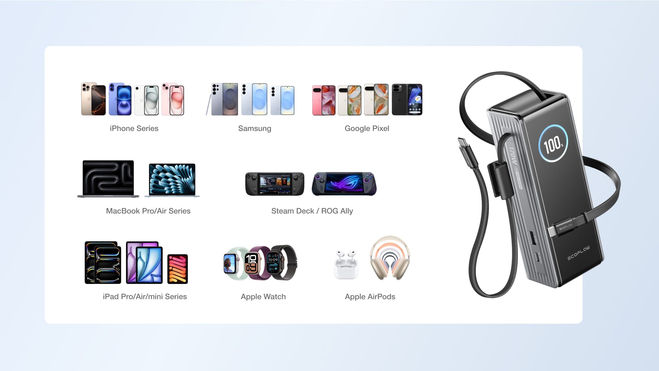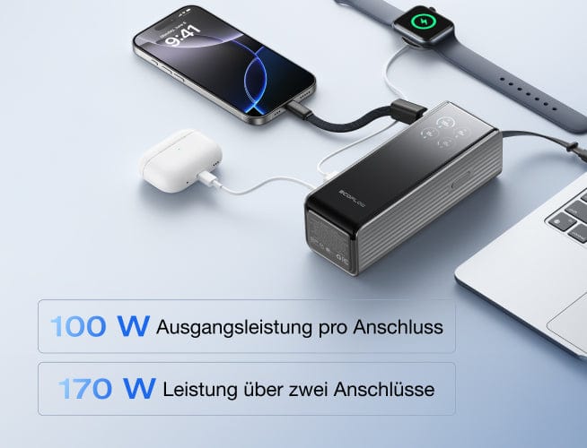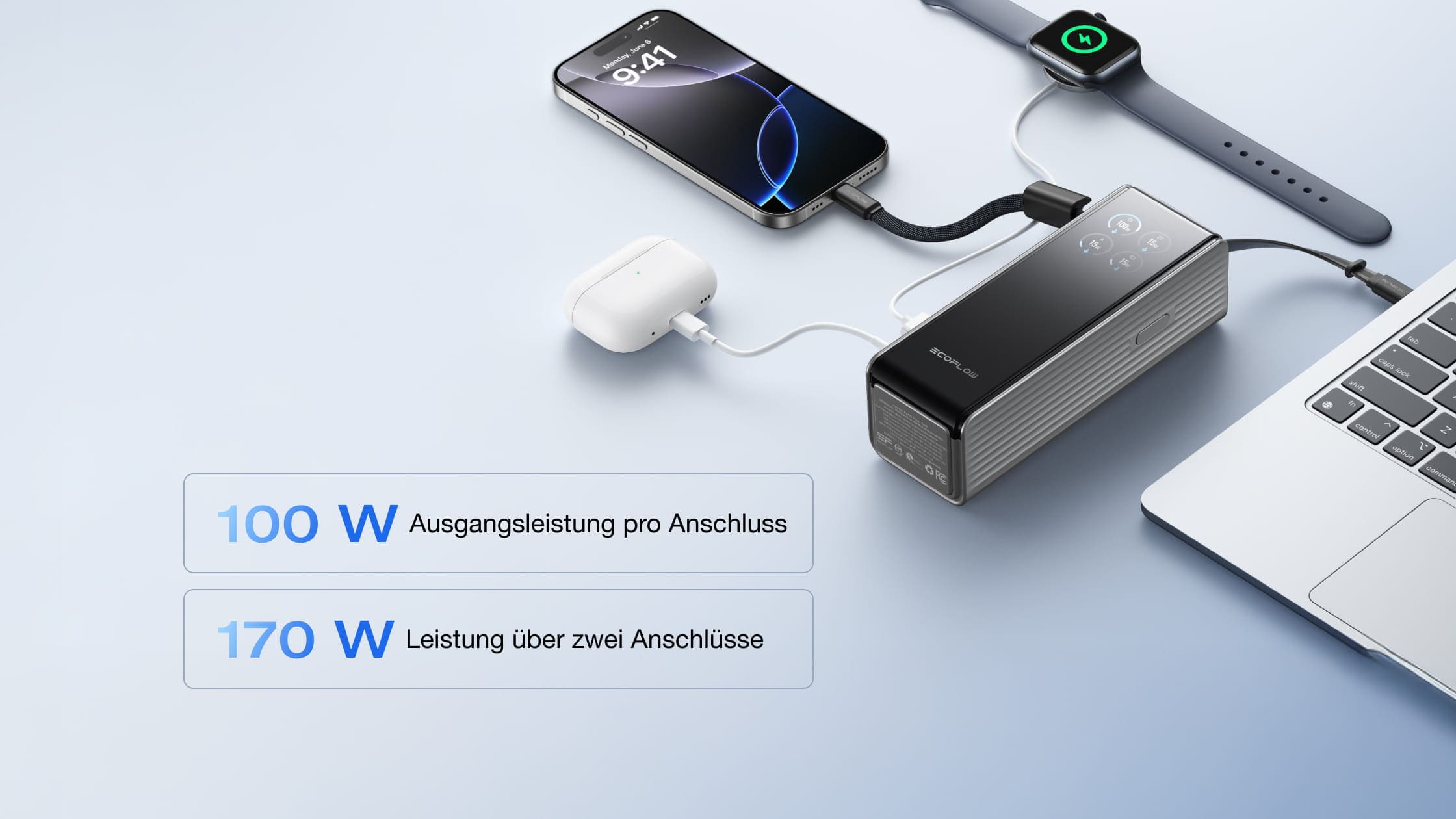 Spezifikationen - EcoFlow RAPID Powerbank (25 000 mAh, 170 W, 100 W integrierte und einziehbare Kabel)