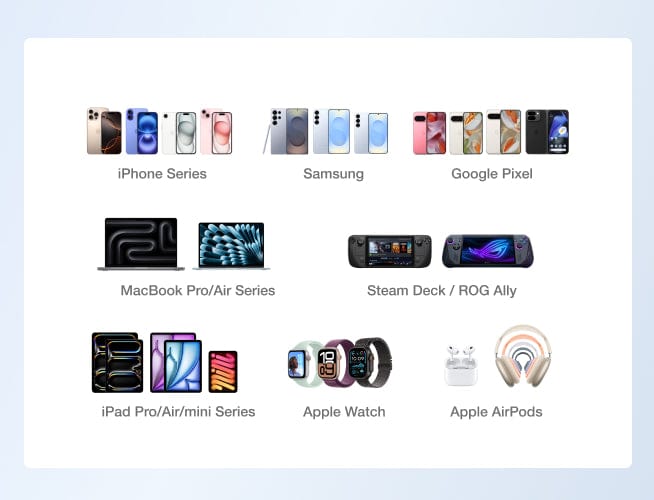 Kompatible Geräte sind Laptops, Telefone, Tablets, Kopfhörer, Smartwatches, Spielkonsolen und andere Geräte mit USB-C Anschlüssen wie MacBook Pro/Air, iPhone, iPad, Dell XPS und Samsung Galaxy.