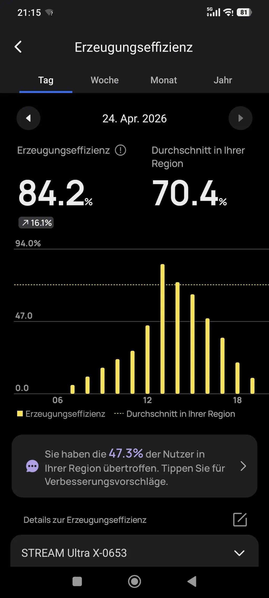 2. EcoFlow STREAM Ultra liefert jährlich 2 218 kWh Solarenergie und deckt 71,3 % des durchschnittlichen Haushaltsverbrauchs in Deutschland (3 113 kWh/Jahr) durch eine 24/7 Solarstromversorgung. Basierend auf dem Strompreis von 0,40 €/kWh ergibt sich eine jährliche Ersparnis von 1 109 €. Die tatsächliche Ersparnis kann je nach Nutzungsverhalten und regionalen Energiepreisen variieren.