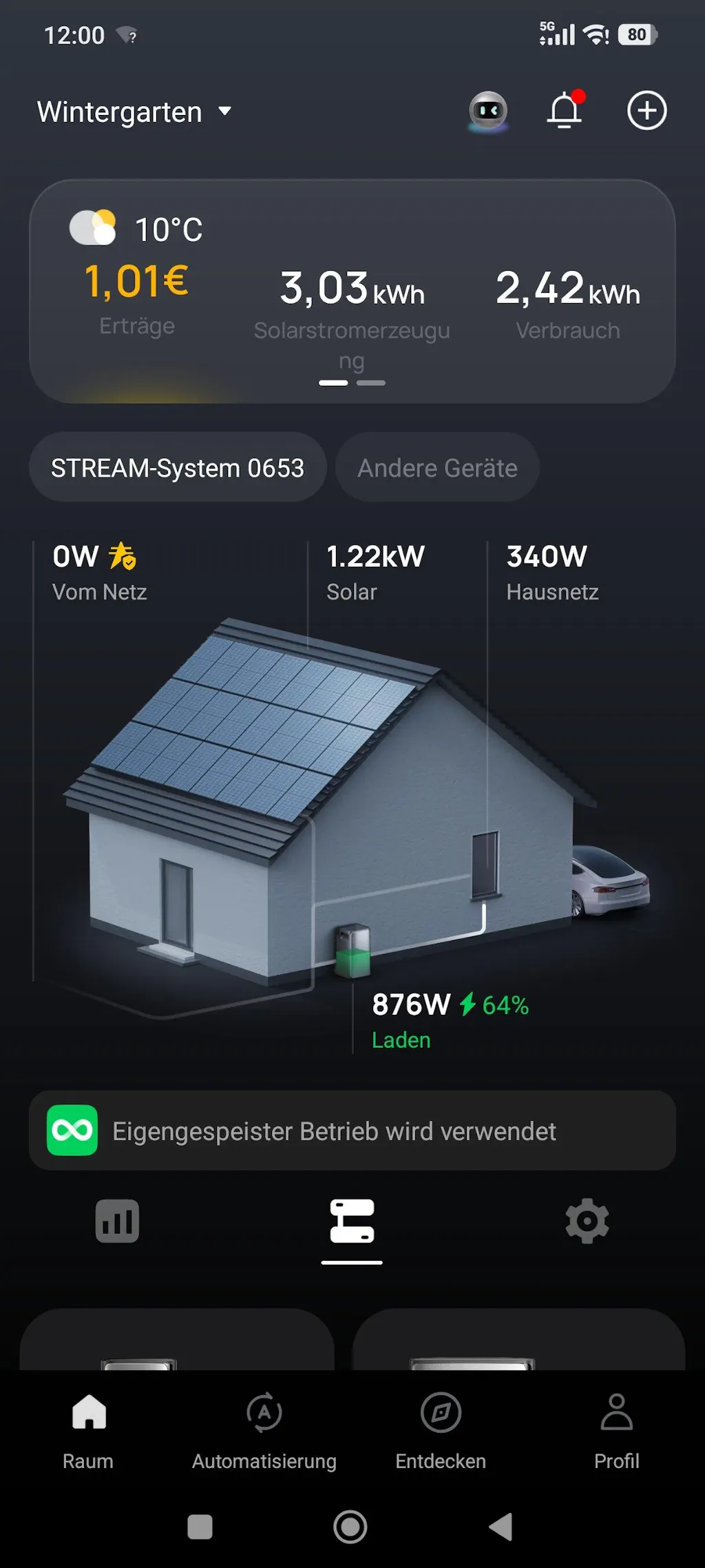Das System nutzt vorrangig Solarenergie. Wenn die Solarleistung den Energiebedarf nicht deckt, springt automatisch der Akku ein. Reicht auch das nicht aus, wird der verbleibende Bedarf über das Stromnetz gedeckt. Wenn die Solarproduktion den Verbrauch übersteigt, wird der Überschuss zunächst in der Batterie gespeichert. Weitere überschüssige Energie kann – je nach Einstellung und unter Einhaltung der lokalen Vorschriften – ins Netz eingespeist werden.